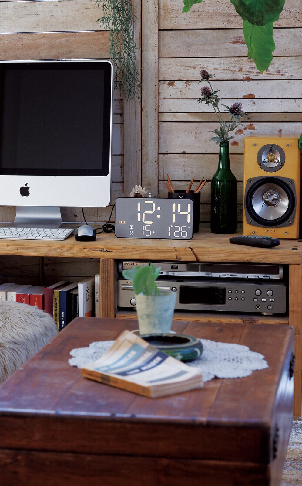 明るい場所でも暗い場所でも一目で時刻を確認できる視認性抜群の置き掛け兼用時計。