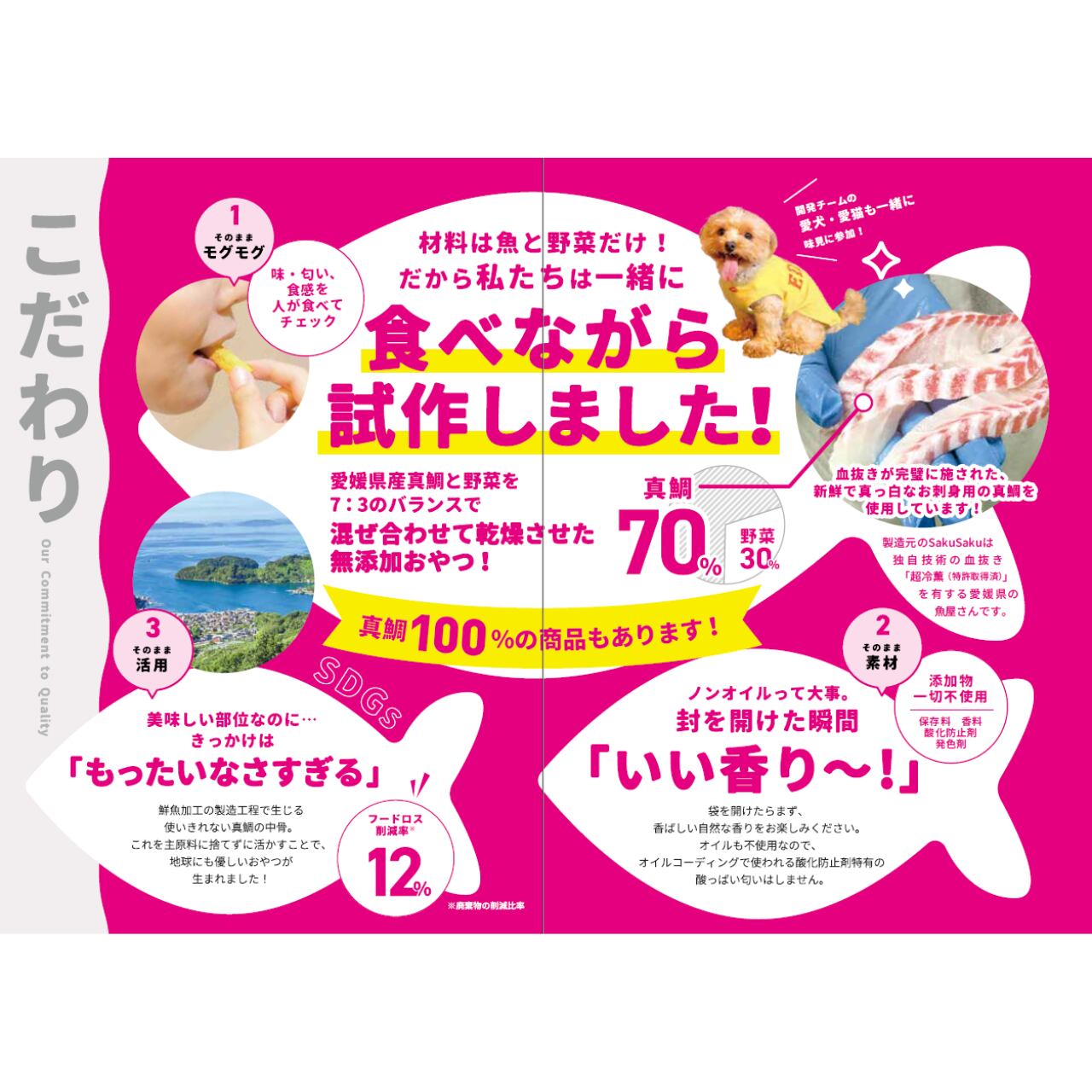 ワンちゃんと飼い主様が一緒に食べられる、愛媛県産の真鯛100%だけでつくったおやつです。