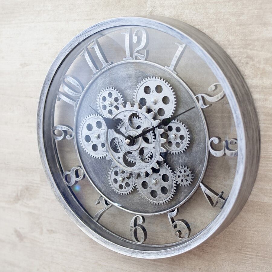 大胆に露出したギアが、空間にインダストリアルな美しさを添える壁掛け時計。