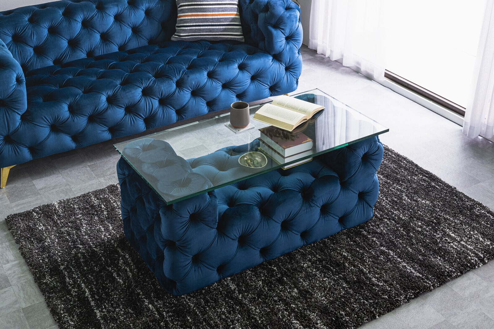 お部屋にクラシックな華やぎを添える、チェスターフィールドスタイルのセンターテーブル。ベルベット調の張地に施されたボタン留めのディテールが、まるで英国の伝統的な家具のような重厚感と高級感を演出します。