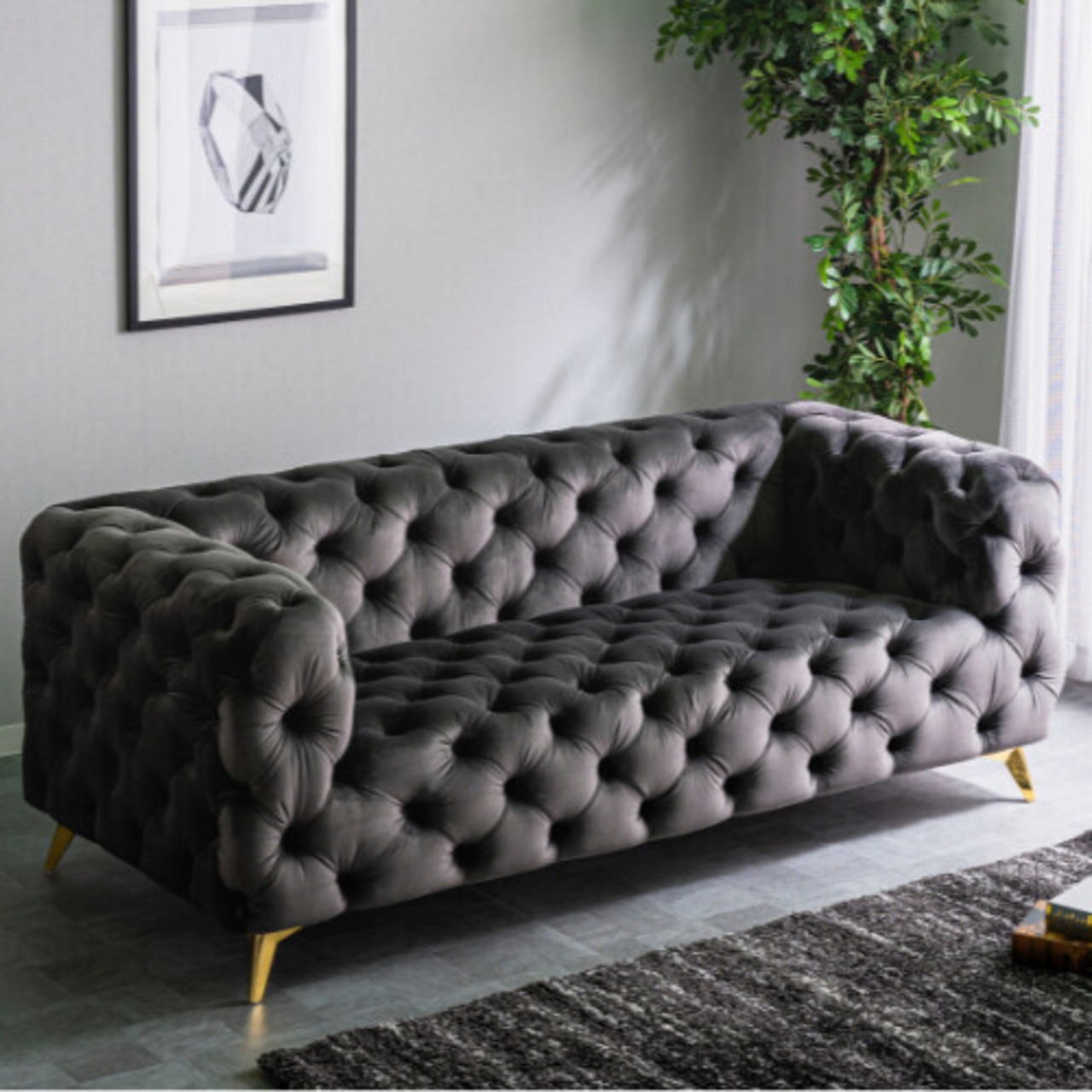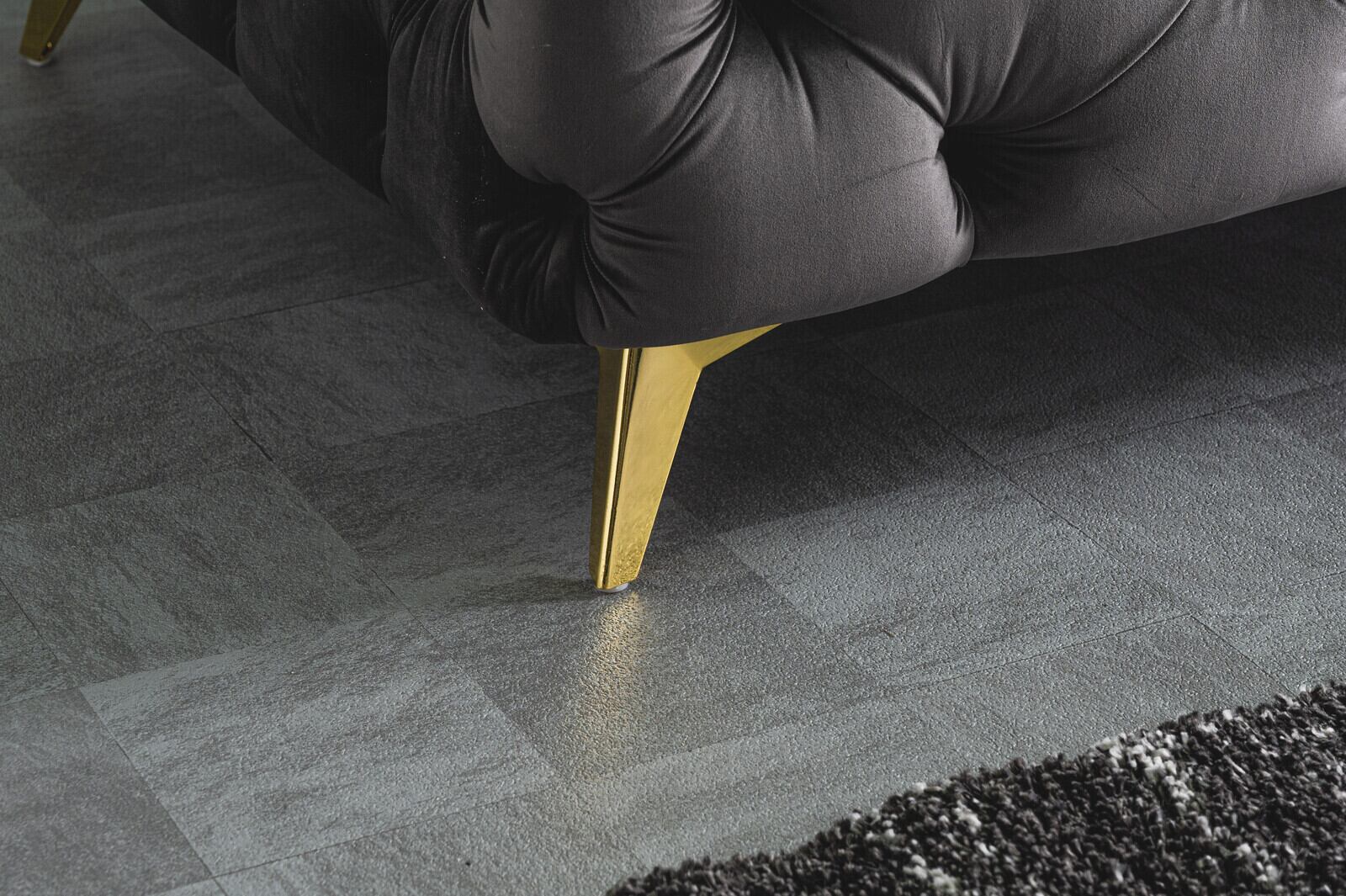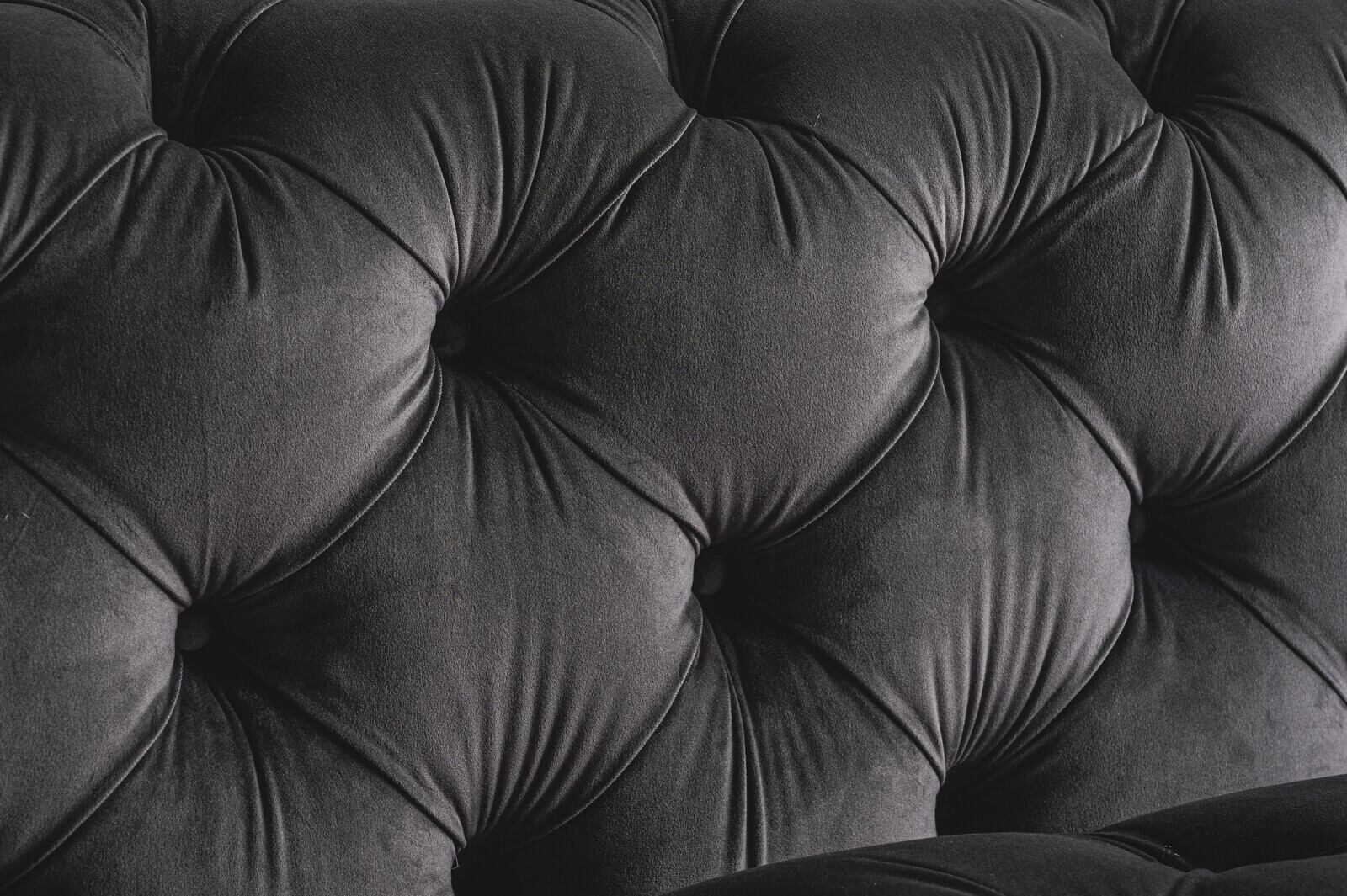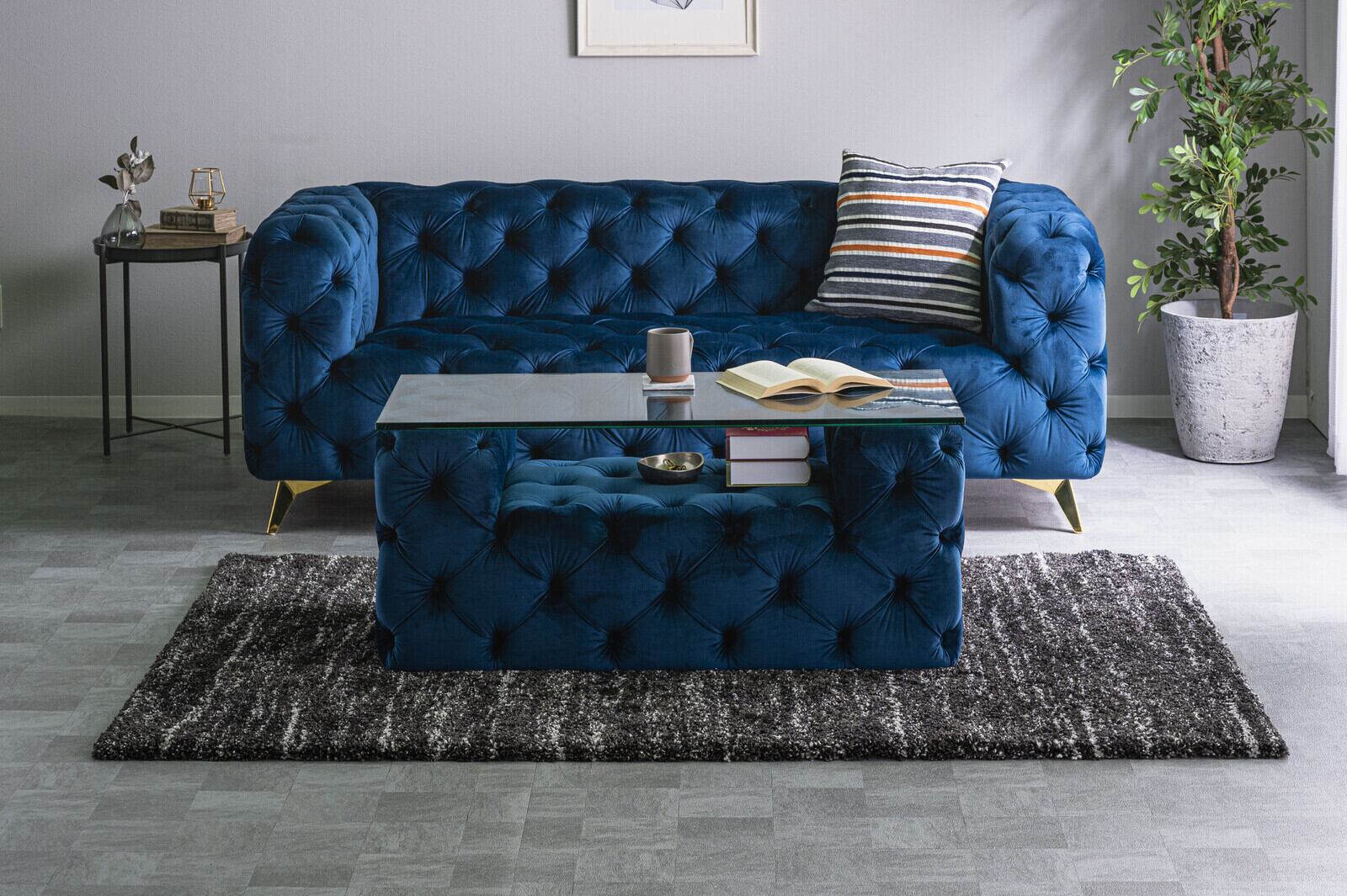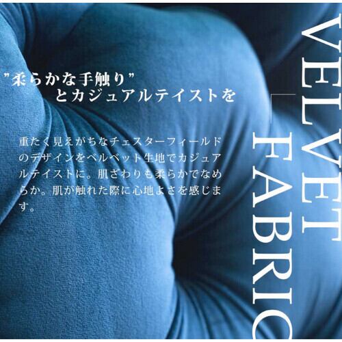 ベルベット調の張地に施されたボタン留めやゴールドの脚が、まるで英国の伝統的な家具のような重厚感と高級感を演出します。