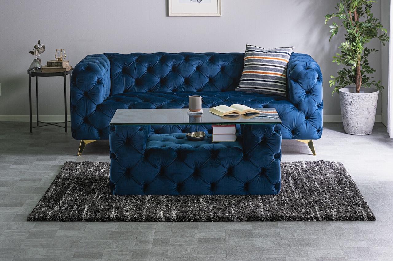 お部屋にクラシックな華やぎを添える、チェスターフィールドスタイルの3人掛けソファ。