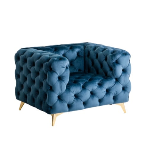 ベルベット調の張地に施されたボタン留めやゴールドの脚が、まるで英国の伝統的な家具のような重厚感と高級感を演出します。