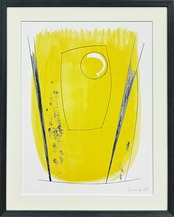 やかなイエローの広がりの中に、静かな線と円が配置された作品。