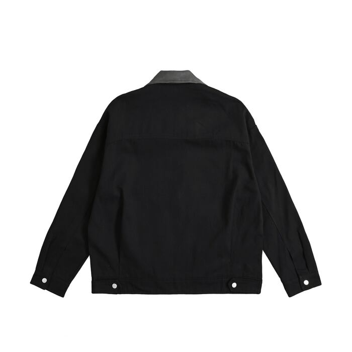 ワークウェアの力強さをベースに、マットな質感のフェイクレザーを襟に切り替えたバイカラーデザインが印象を引き締めます。