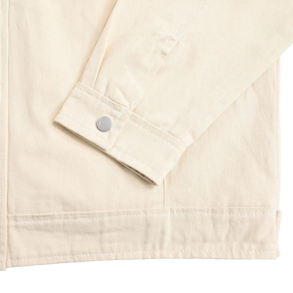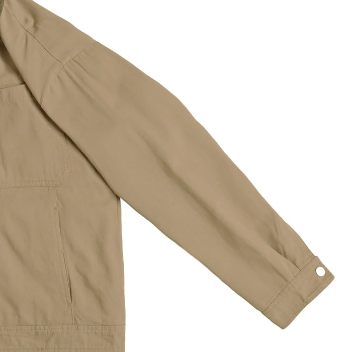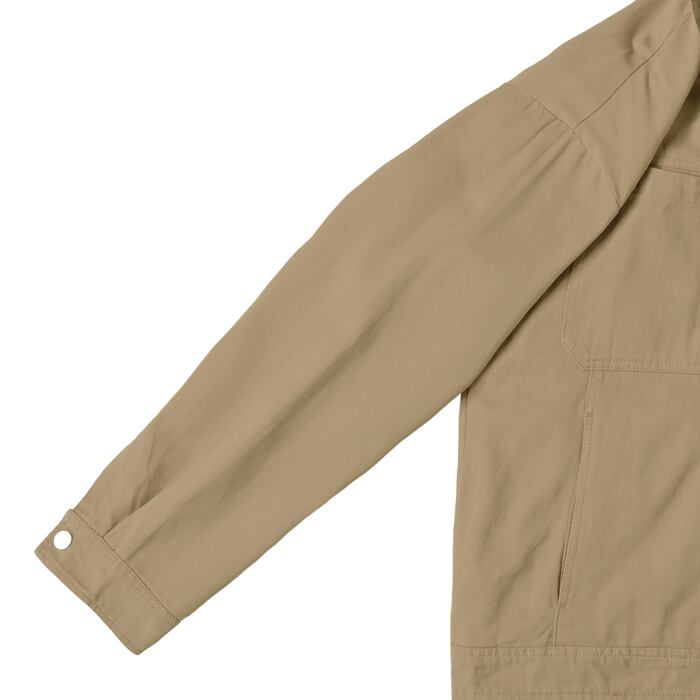 胸元のポケット、比翼仕立てのフロントボタンなど、ワークジャケットならではの実用性をしっかり踏襲。