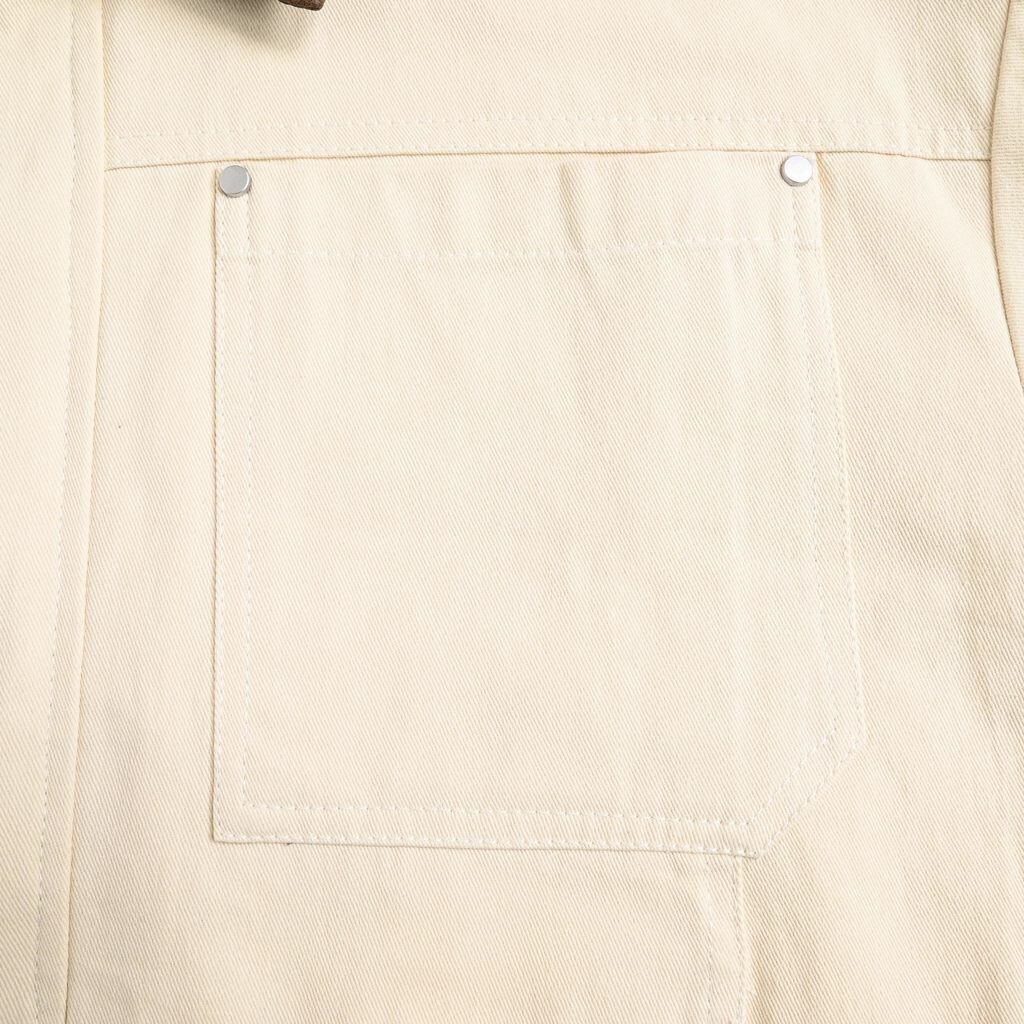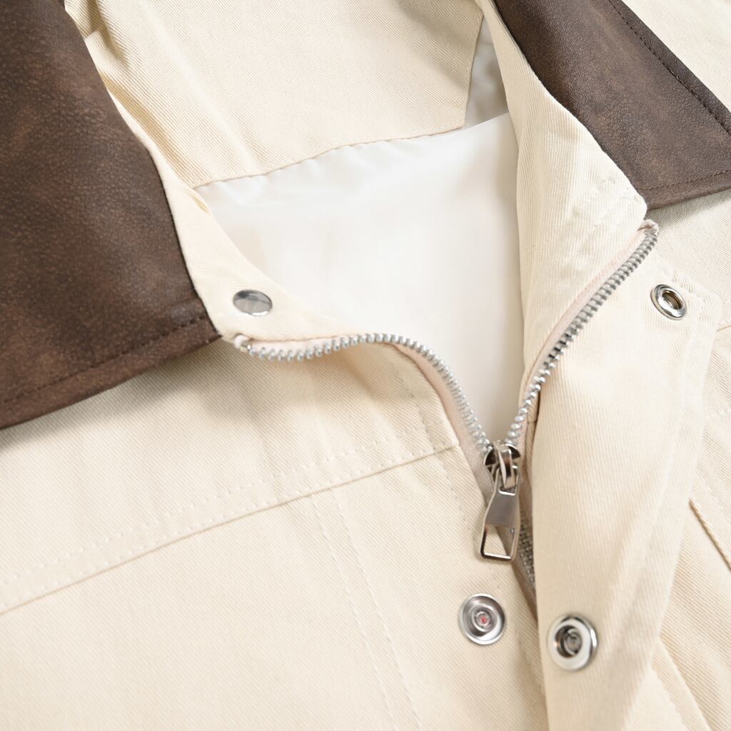 ワークウェアの力強さをベースに、マットな質感のフェイクレザーを襟に切り替えたバイカラーデザインが印象を引き締めます。