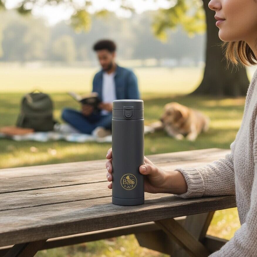 こちらのステンレスボトルは、片手でスマートに使えるワンタッチ式の便利なアイテムです。
