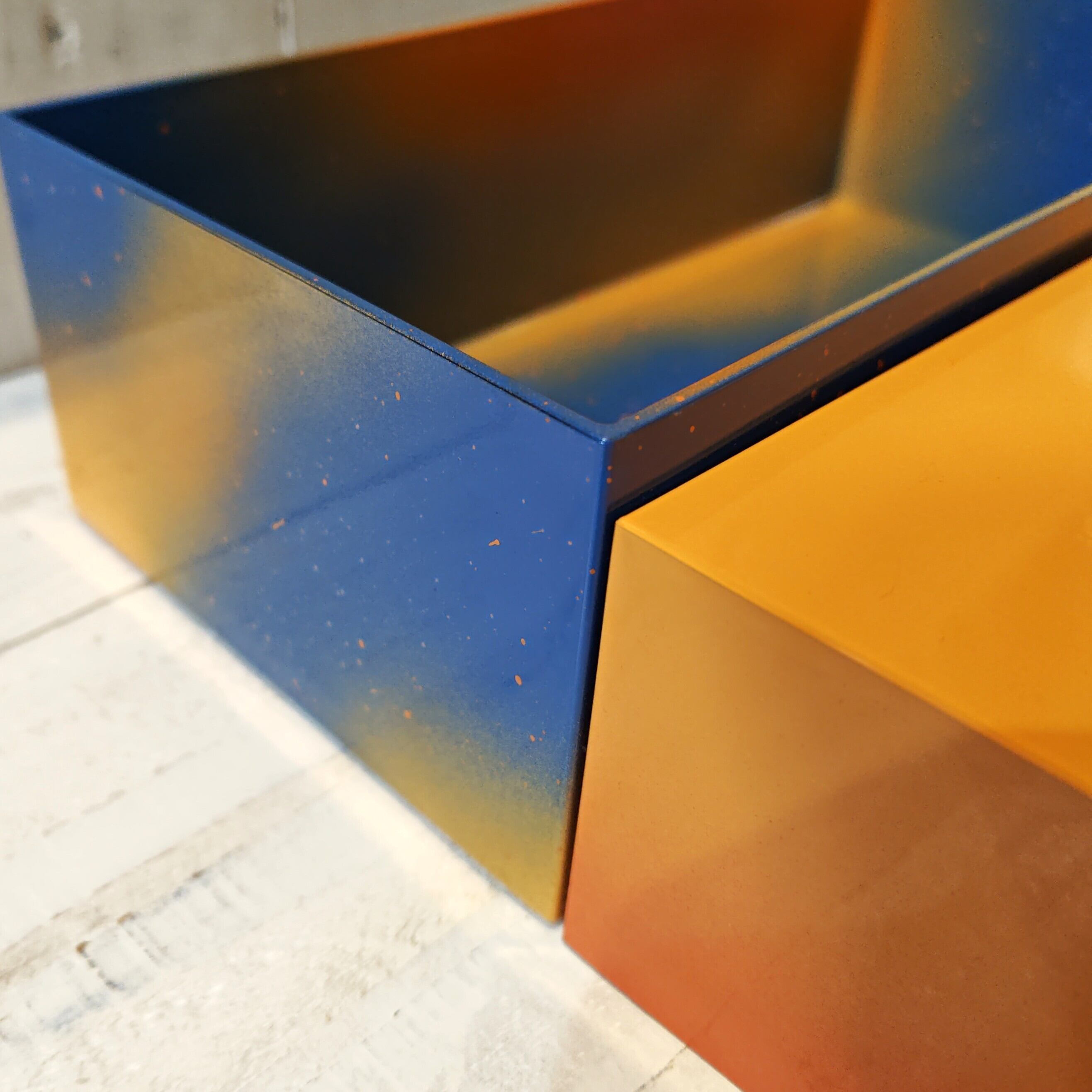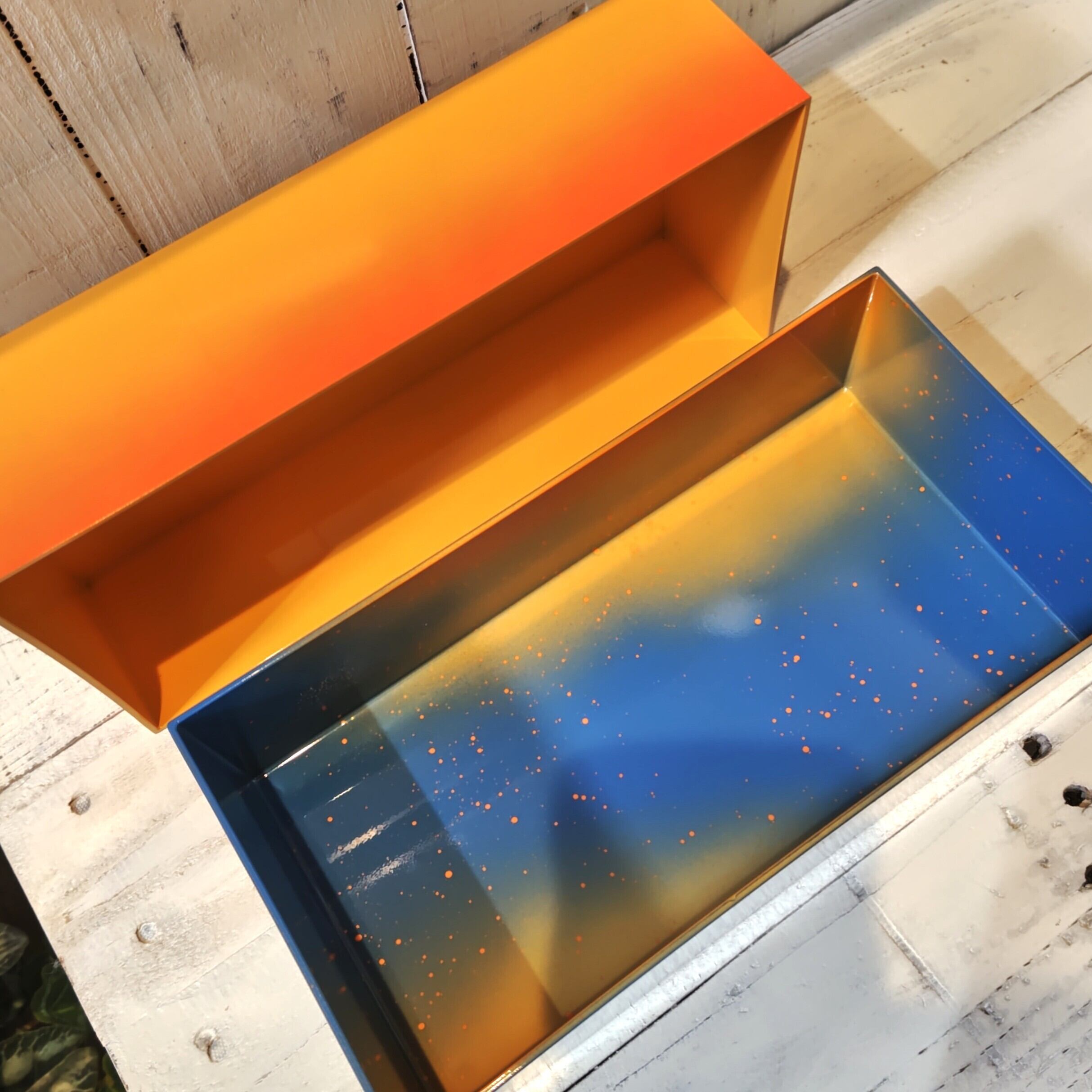 蓋は橙のグラデーションが滑らかに広がり、身の部分には海に差し込む光を思わせる変わり塗を採用。