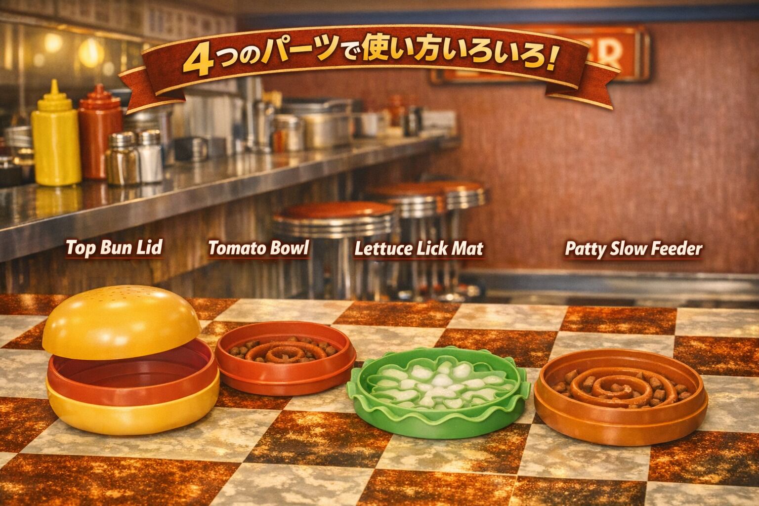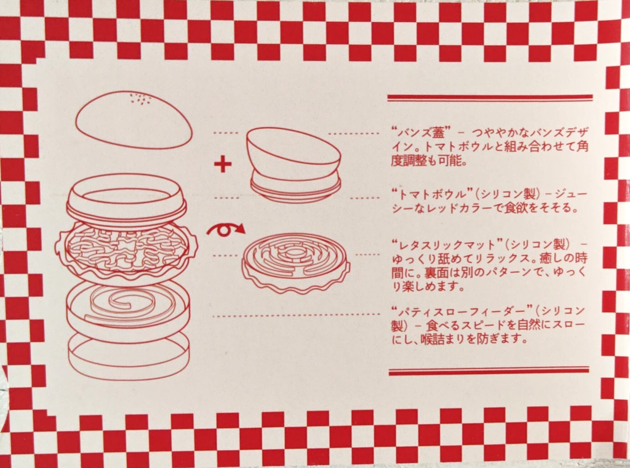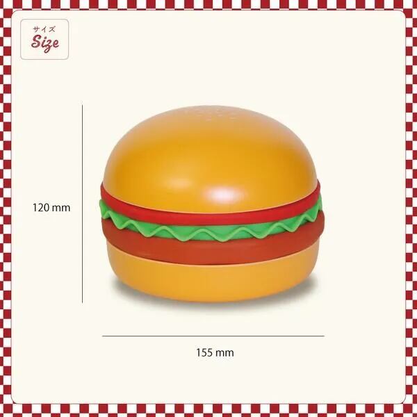 バンズ・トマト・レタス・パティをモチーフにしたパーツ構成で、重ねればリアルなバーガーの形に。分けて使えば用途に応じたフードトレーとして活躍します。