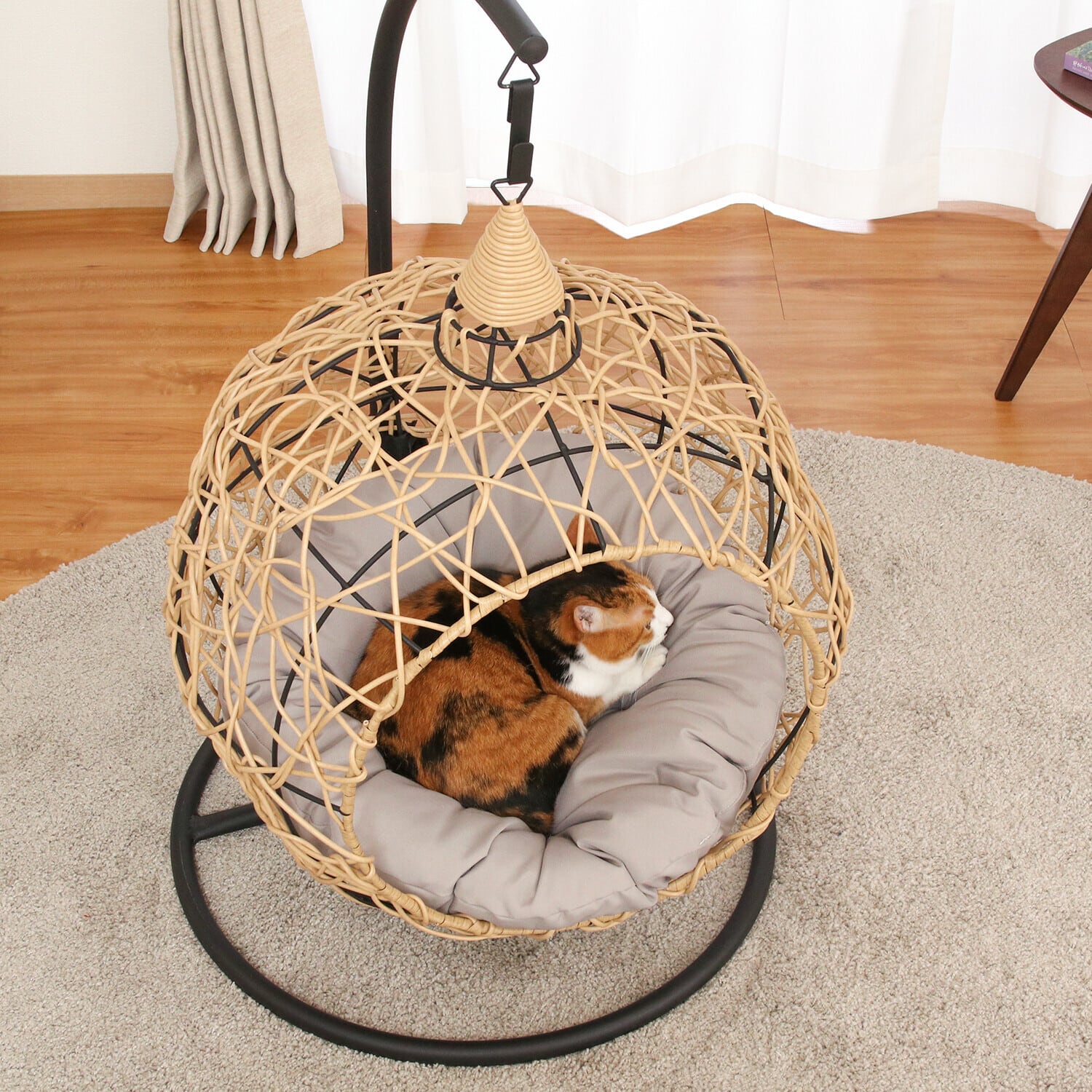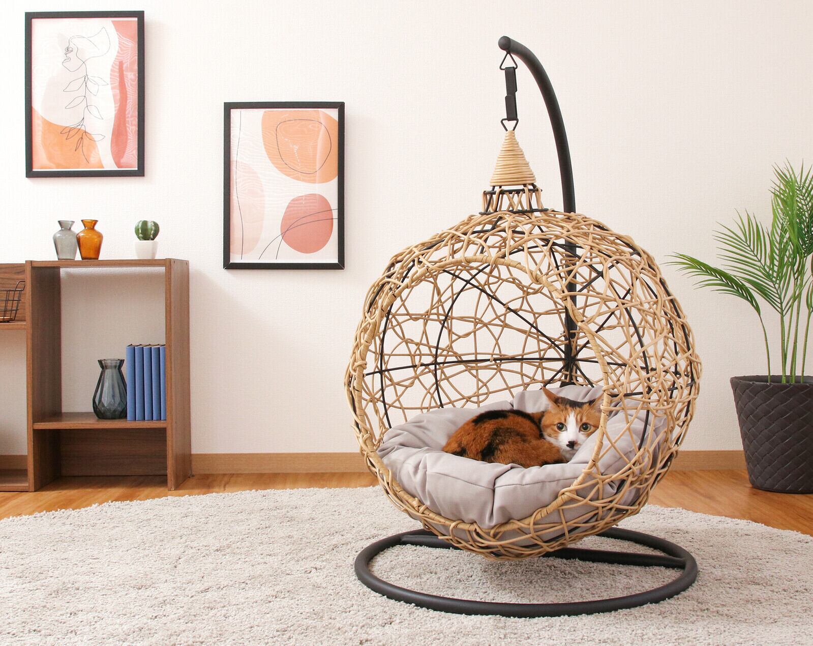 程よい揺れを楽しめるハンギングチェアはペットにとっても癒しのアイテム。
