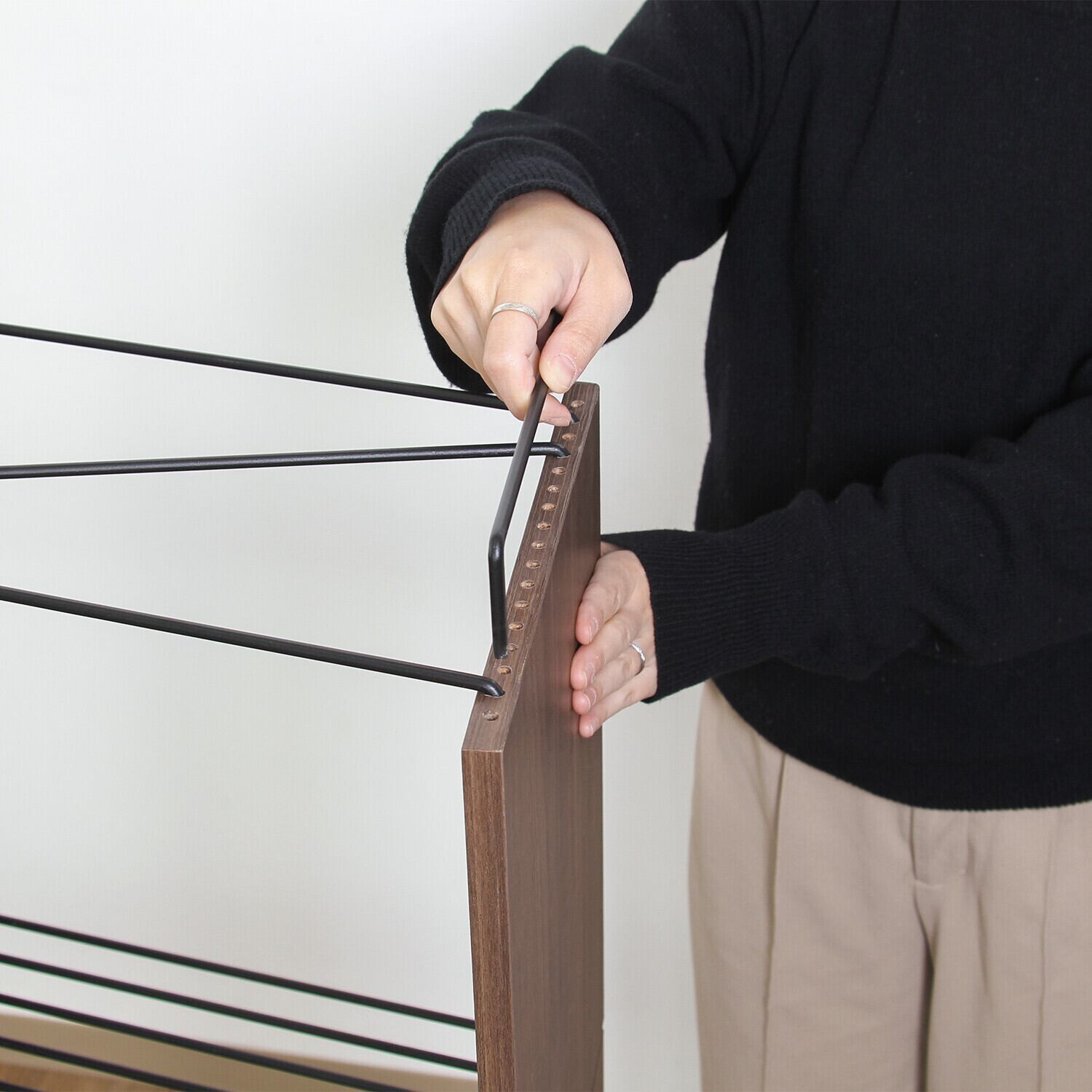 棚板の穴にワイヤーフレームを差し込むだけで完成する「ワイヤーロックシステム」を採用したシリーズで、細いスチールの線が芸術作品のような美しさを見せるアートなデザインを楽しめます。